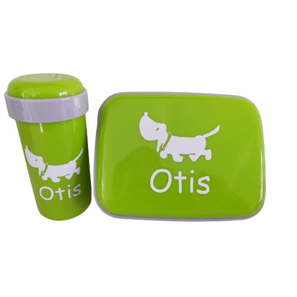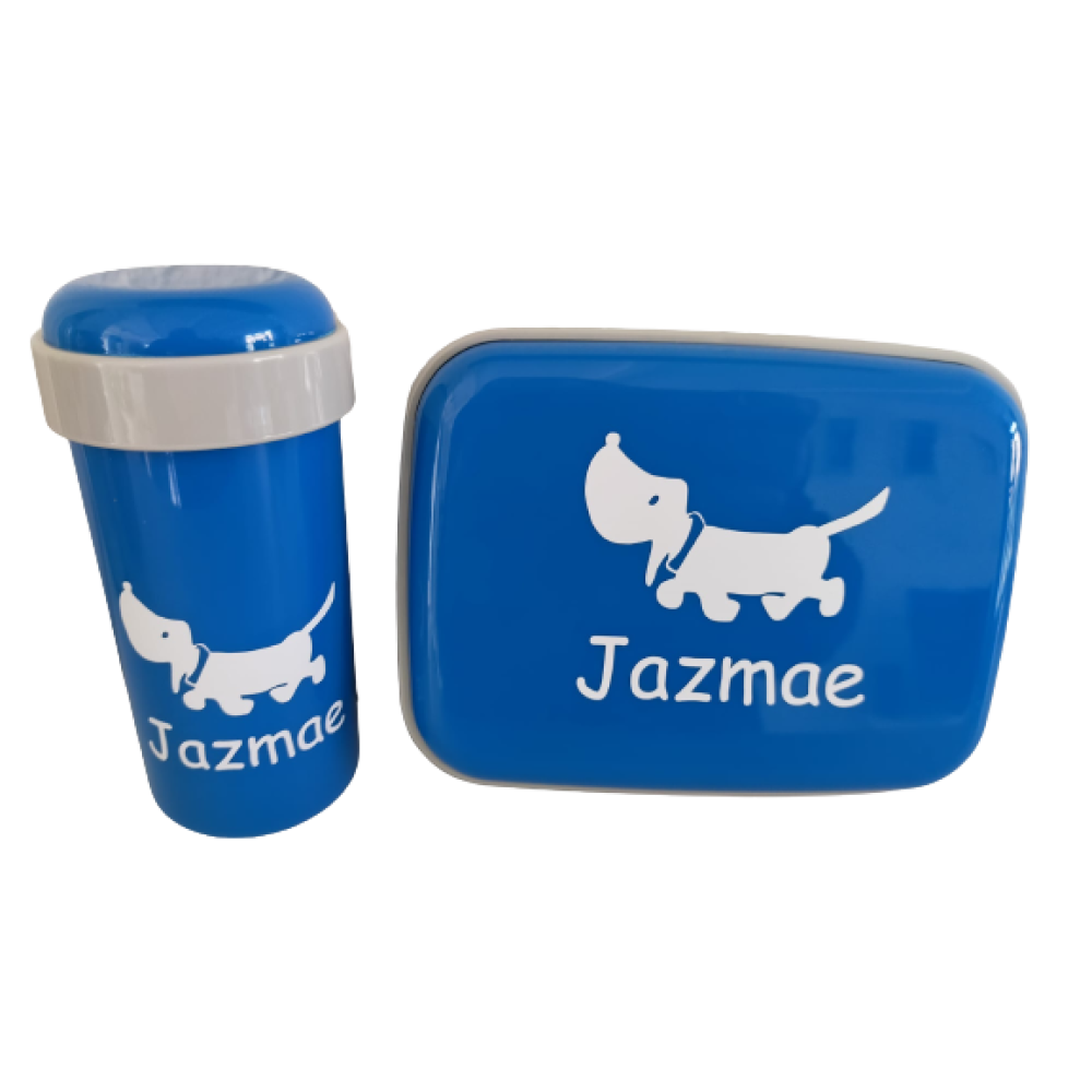 Broodtrommel en beker worden bedrukt met een stevige vinylsticker.
