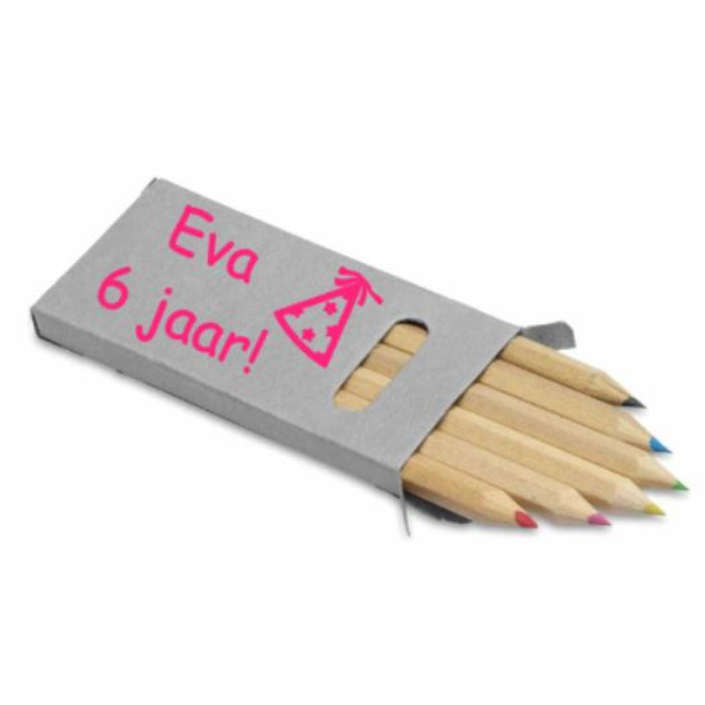 Inhoud: 6 mini-potloden in een kartonnen doosje Afmeting doosje: 9 x 4,5 cm.