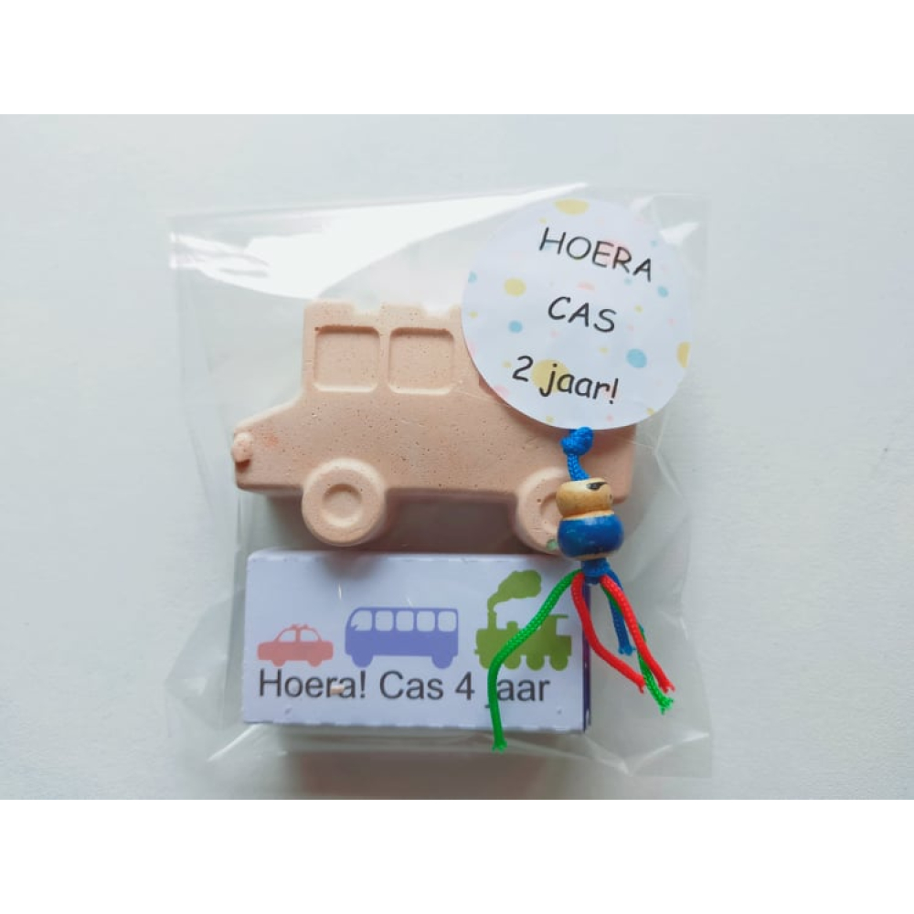 Het stoepkrijt wordt gratis verpakt in cellofaan met daarop een sticker