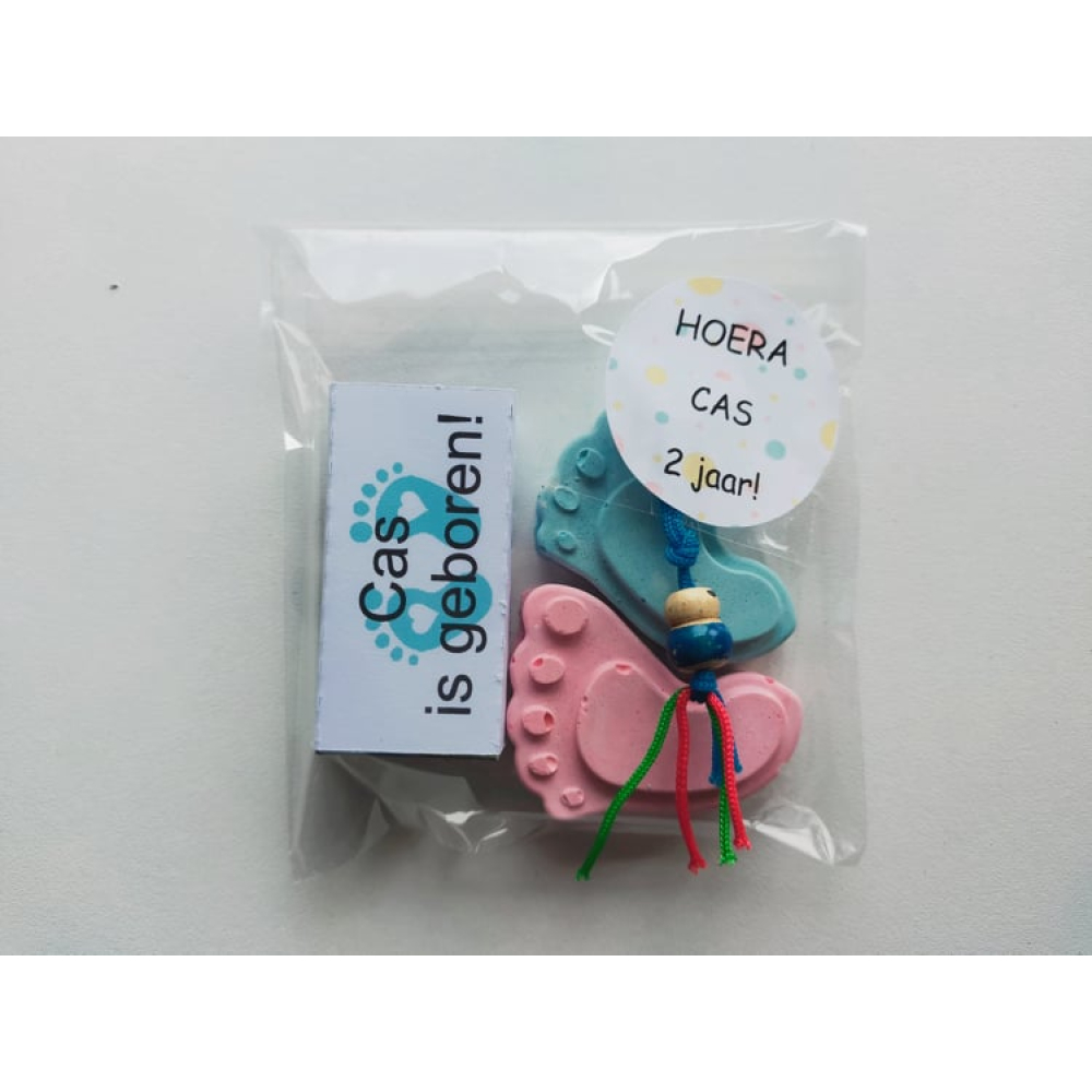 Het stoepkrijt wordt gratis verpakt in cellofaan met daarop een sticker